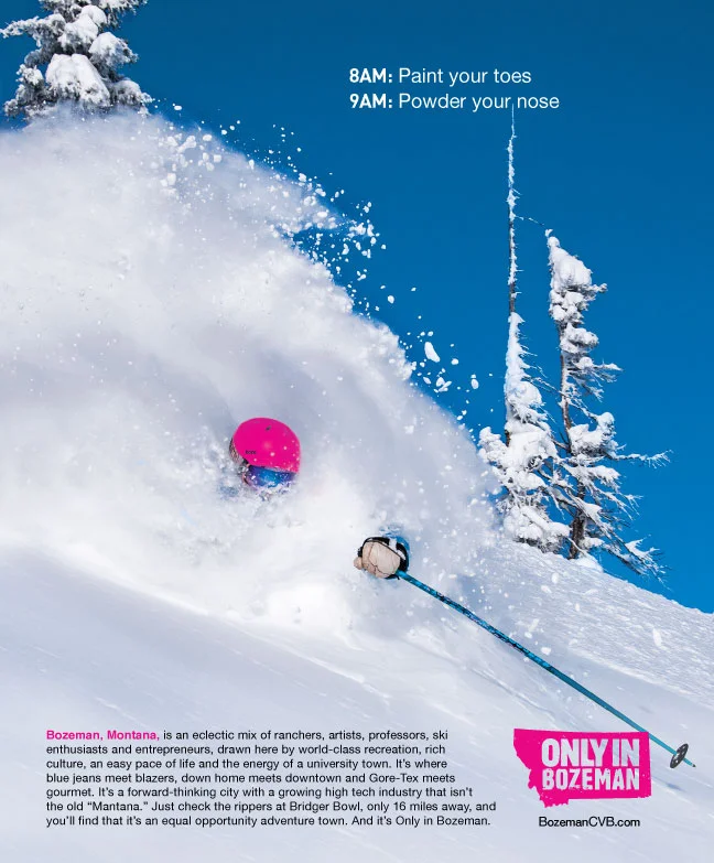 As a team, we at Flying Horse Communication, brainstormed the most attractive activities that Bozeman had to offer. Skiing was an obvious choice. Once, we landed on a great photo, it was decided to cater the ad to female winter athletes, a sector that is not always acknowledged in the winter industry.